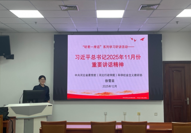 12月11日,省委党校(河北行政学院)科学社会主义教研部举行了2025年第7期 “听君一席话” 系列学习听讲活动。徐雪苗老师带领大家总结回顾了习近平总书记2025年11月份的重要讲话和重要论述精神,围绕高质量发展、高水平安全、高水平对外开放三大主线进行了系统梳理解读。